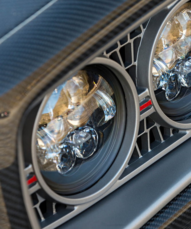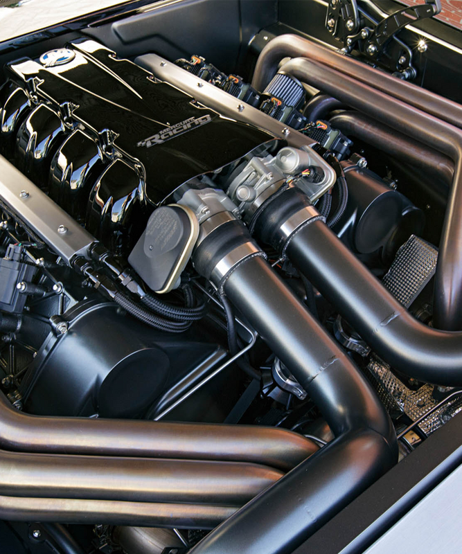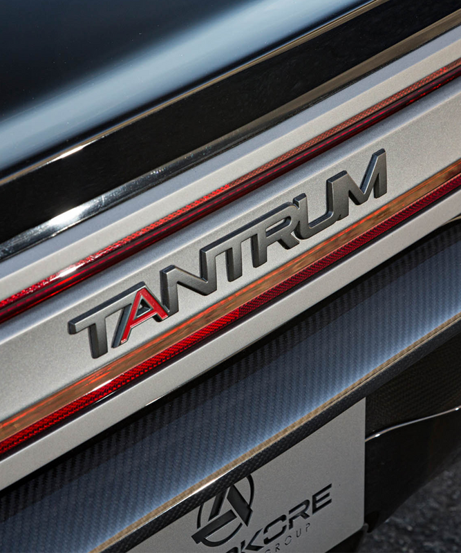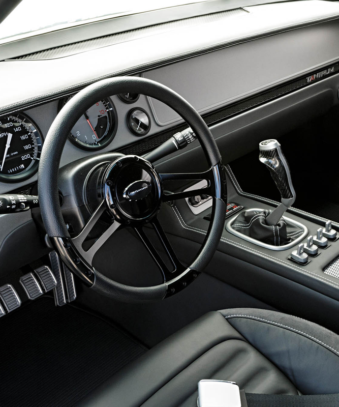 Custom-built components include full carbon-fiber front fenders, hood, valances and bumpers. The carbon-fiber weave shines through a gloss finish at the front before tapering off into a mirror-like black PPG finish over the hood and front wheel arches. The grille was milled in-house from a single block of aluminum before being fitted with a set of custom LED projector headlights. The rear is accented by a CNC-machined trim panel housing modern taillamps and inscribed with “Tantrum”.