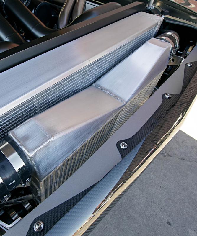 Beneath the carbon-fiber hood sits a QC4V engine setup from Mercury Racing. “Tantrum” is the first application of a Mercury Marine engine into a street vehicle. The QC4V is a 90-degree double-overhead-cam V8 displacing 9.0-liters and fed by a pair of 94mm turbochargers. Total output is 1,650 horsepower on 110 Octaine. The Mercury Racing engine is mated to Tremec T-56 Bowler six-speed manual transmission routing power through a Ford 9-inch rear end.