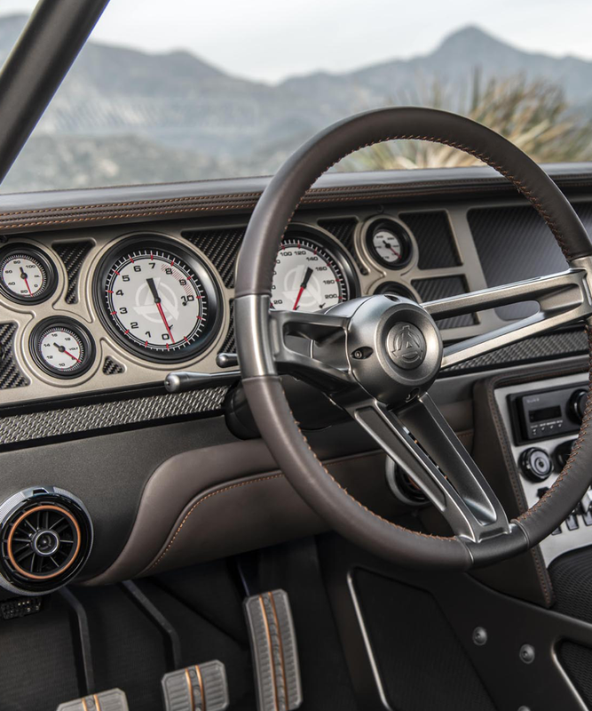 The transmission tunnel trussing is as functional as it is decorative, supporting the billet seat bases. The cabin seamlessly blends classic aesthetics with modern amenities and features a SpeedKore custom-fabricated steering wheel, door panels, dashboard, center console, steering column, pedal assembly and Classic Instruments gauges.
