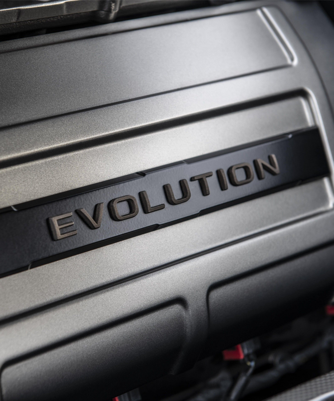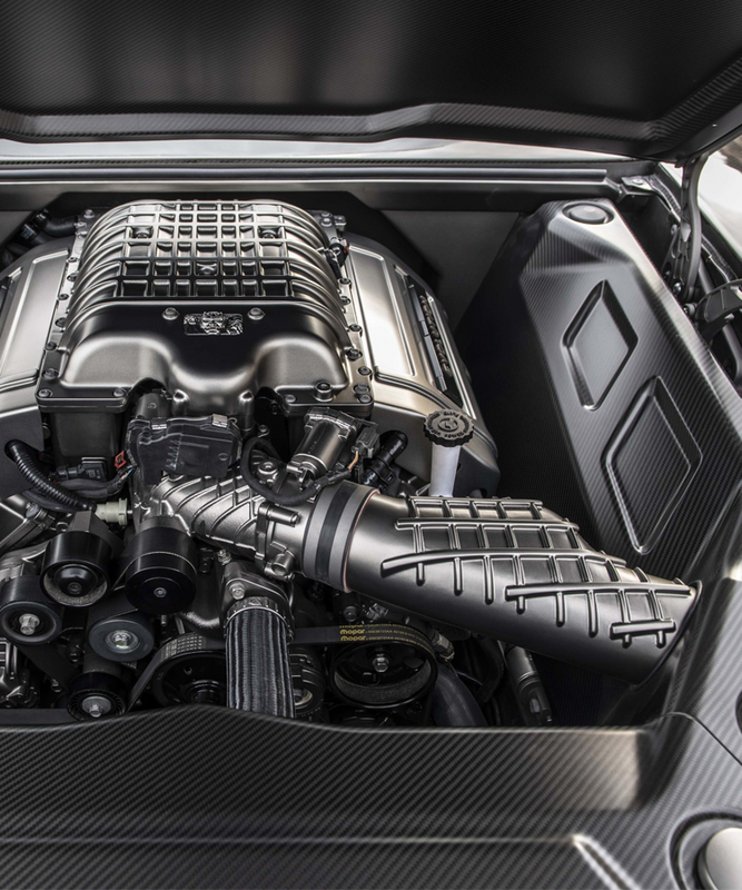 Power comes from Dodge’s formidable 6.2-liter Demon engine modified for increased performance. The supercharged V8 features a smaller drive pulley, custom software controls, larger fuel injectors and a one-off SpeedKore cold-air intake. The result is a dyno-proven 966 horsepower at the rear wheels. The Demon breathes via stainless-steel SpeedKore headers and a complete exhaust system utilizing SLP mufflers. The engine is also fitted with a Dailey Engineering dry sump, upgraded oil cooler and Saldana radiator.“Evolution” uses a Tremec TR-6060 six-speed manual transmission that routes power through a Driveshaft Shop carbon-fiber driveshaft and Strange 9-inch rear end.