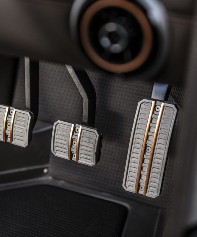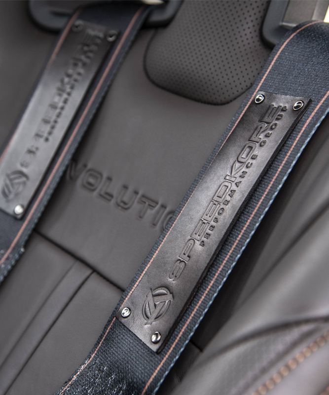 The exterior is rendered entirely of carbon fiber, including the front fenders, doors, rear quarter panels, roof, hood, front and rear bumpers valances, and more. “Evolution” has a clear-coat finish to ensure durability. What isn’t carbon fiber on the exterior is billet aluminum, machined in the SpeedKore headquarters in Grafton, Wisconsin.