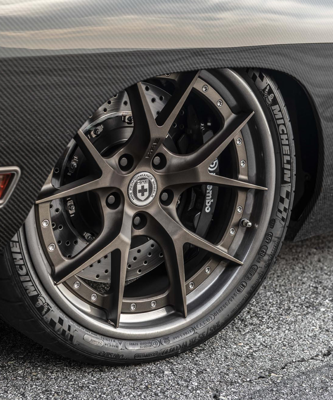 The lightweight body sits on a custom 4x2-inch steel perimeter box frame that was CAD designed and fabricated by SpeedKore. It mounts the HEMI engine and drivetrain, providing suspension pick-up points for the coilovers at each corner and the rack and pinion steering. Aluminum was used for the floor, firewall, CNC-cut and hand-formed transmission tunnel, as well as the radiator shroud. There is also a custom 14-point roll cage to add three-dimensional rigidity, while the fuel and oil lines are concealed in the frame rails for safety and aesthetics. SpeedKore worked closely with Brembo engineers to create a balanced system using Brembo six-piston GT monobloc front calipers and four-piston rears, with 15-inch drilled and vented rotors at both ends. The suspension uses Penske 7500 series double-adjustable coilovers. The 19x9-inch front and 20x12-inch rear HRE S101 wheels are wrapped in 245/35R19 front and 345/40R20 rear Michelin Pilot Sport 2 tires.